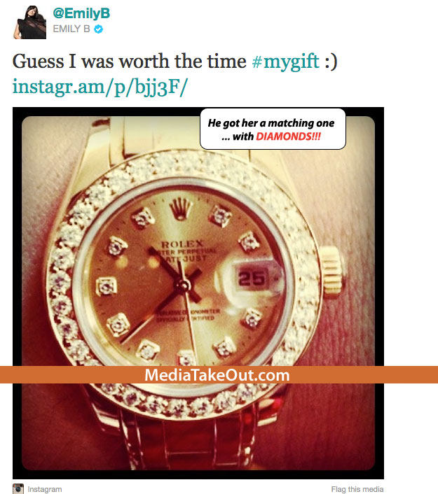 And as a show of love, he bought her the FEMALE version of his favorite watch.Now that rumor about Emily getting KNOCKED UP is starting to make sense . . .